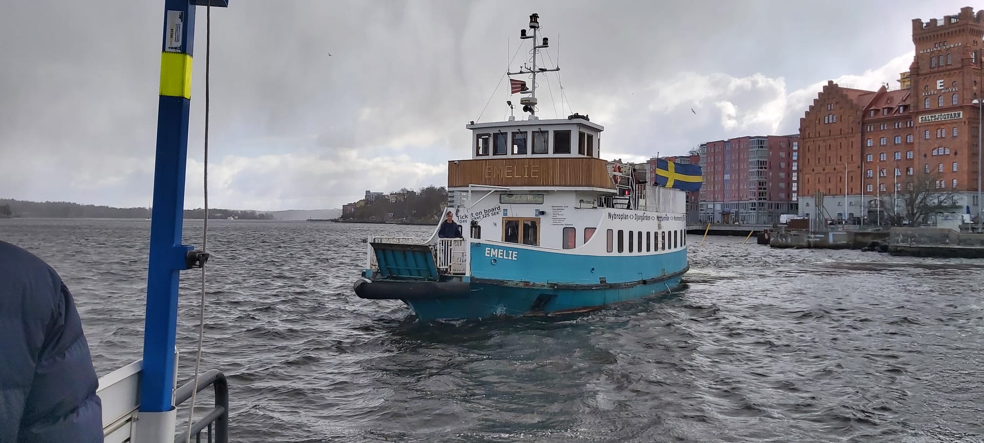 Efter ankomst till Tegelvikshamnen var det endast 25 minuter tills avgång från Masthamnen med Djurgårdsfärjan M/S EMELIE till Gröna Lund och VRAK-museumet.